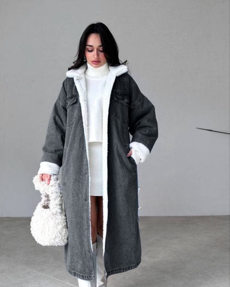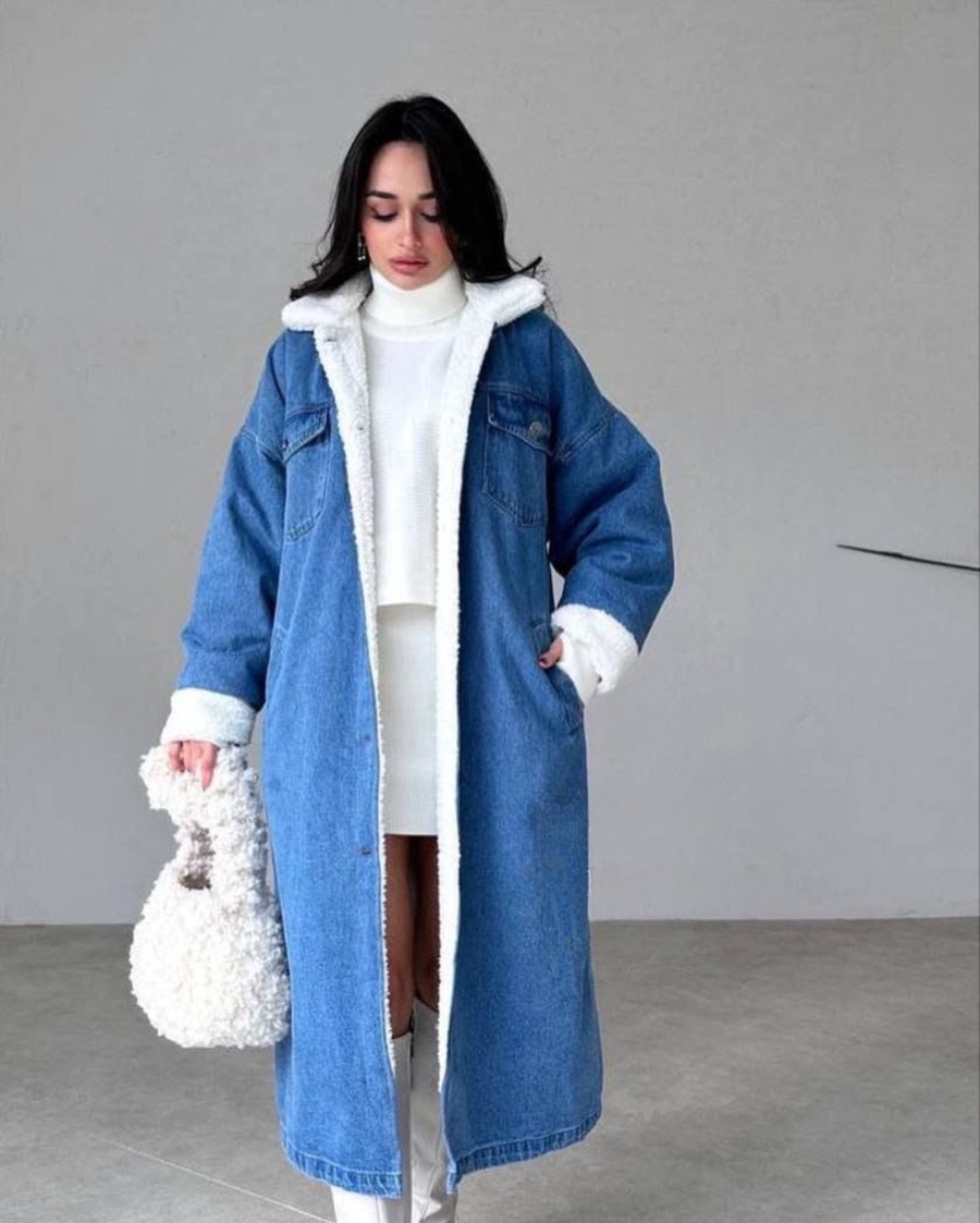 🧥✨ البالطو الجينز المبطن بالفرو – الدفا والأناقة في قطعة واحدة! ✨🧥